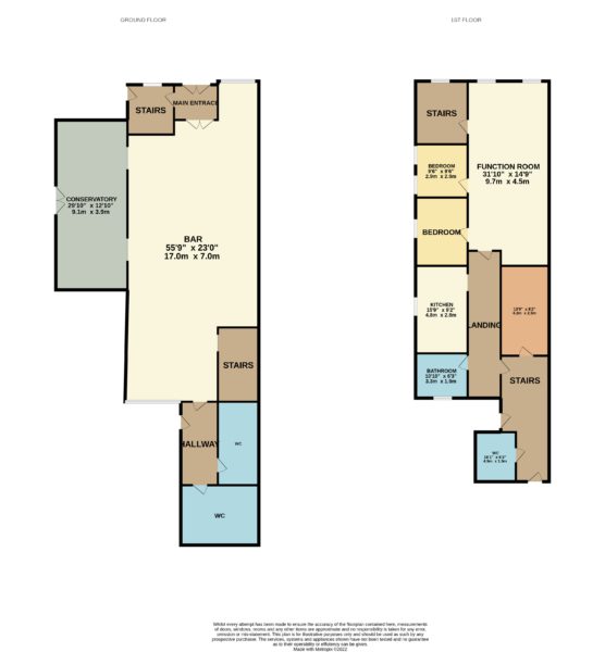 First floor accommodation comprises a lounge/function room, 2 double bedrooms, fitted kitchen, bathroom and storage room with access to the first floor via separate staircase.